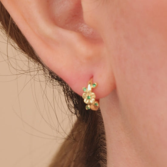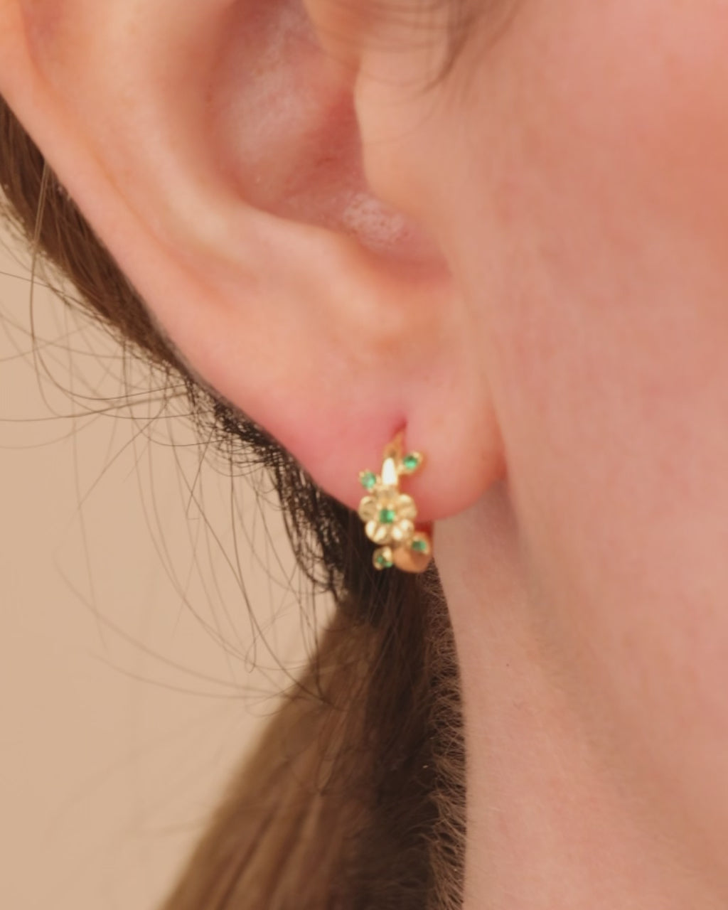 Floral but make it bold. These micro hoops bloom with dimensional petals and emerald-toned CZs—playful, punchy, and perfect for stacking with your everyday staples.