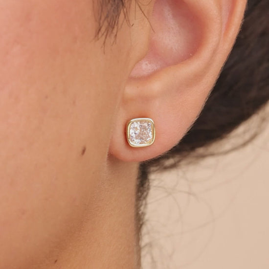 Simplicity with a bold twist. These studs feature Hearts & Arrows Cushion cut stones for insane brilliance, they catch the light from every angle. Wrapped in a sleek, bezel setting and set in non-tarnishing sterling silver, they’re the perfect mix of classic and modern.
