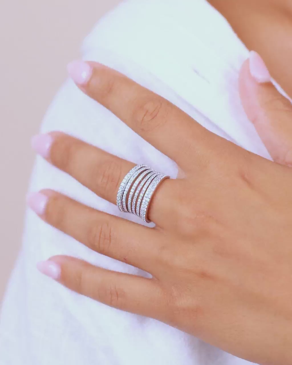 Make a statement with our Sterling Silver Multi-Row CZ Ring. This luxurious ring features multiple rows of dazzling CZ stones, creating an elegant and sophisticated look. Perfect for stacking and adding a touch of luxury to any outfit. Elevate your style with this exquisite piece.