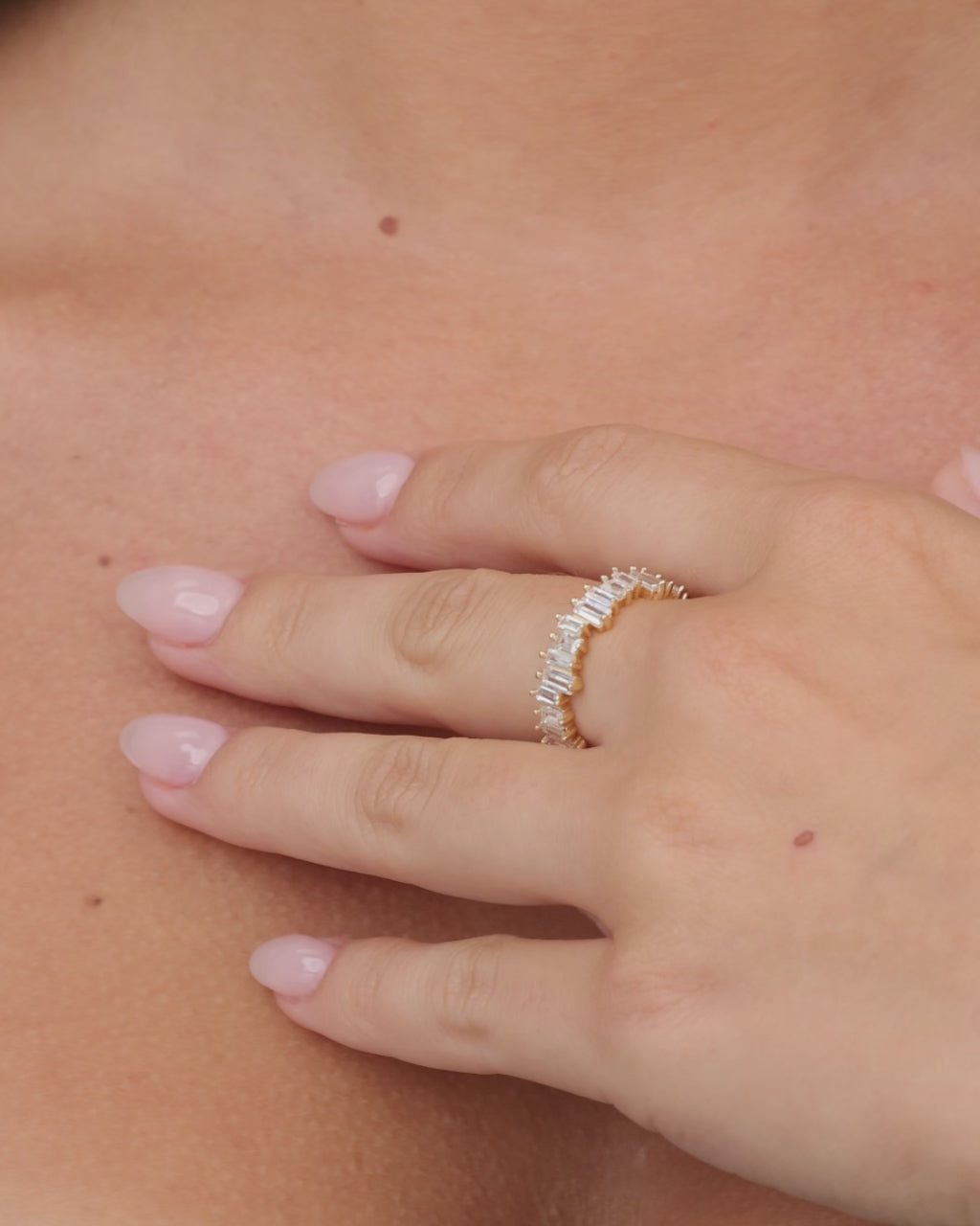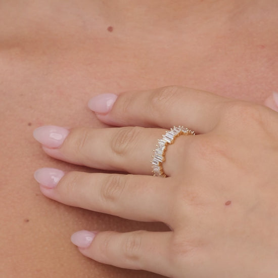 Add a little sparkle wherever you go when you're wearing this sterling silver CZ staggered eternity band! Studded with CZ stones, it's sure to be the perfect bit of glam to go along with any look.
