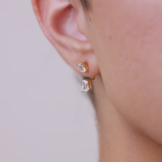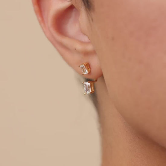 Double up. These sterling silver earring jackets feature two emerald-cut Hearts & Arrows CZs designed to sit just beneath the lobe. Add dimension without adding effort.