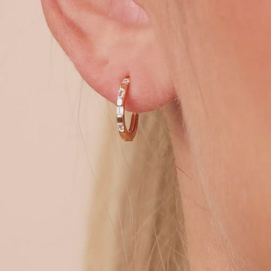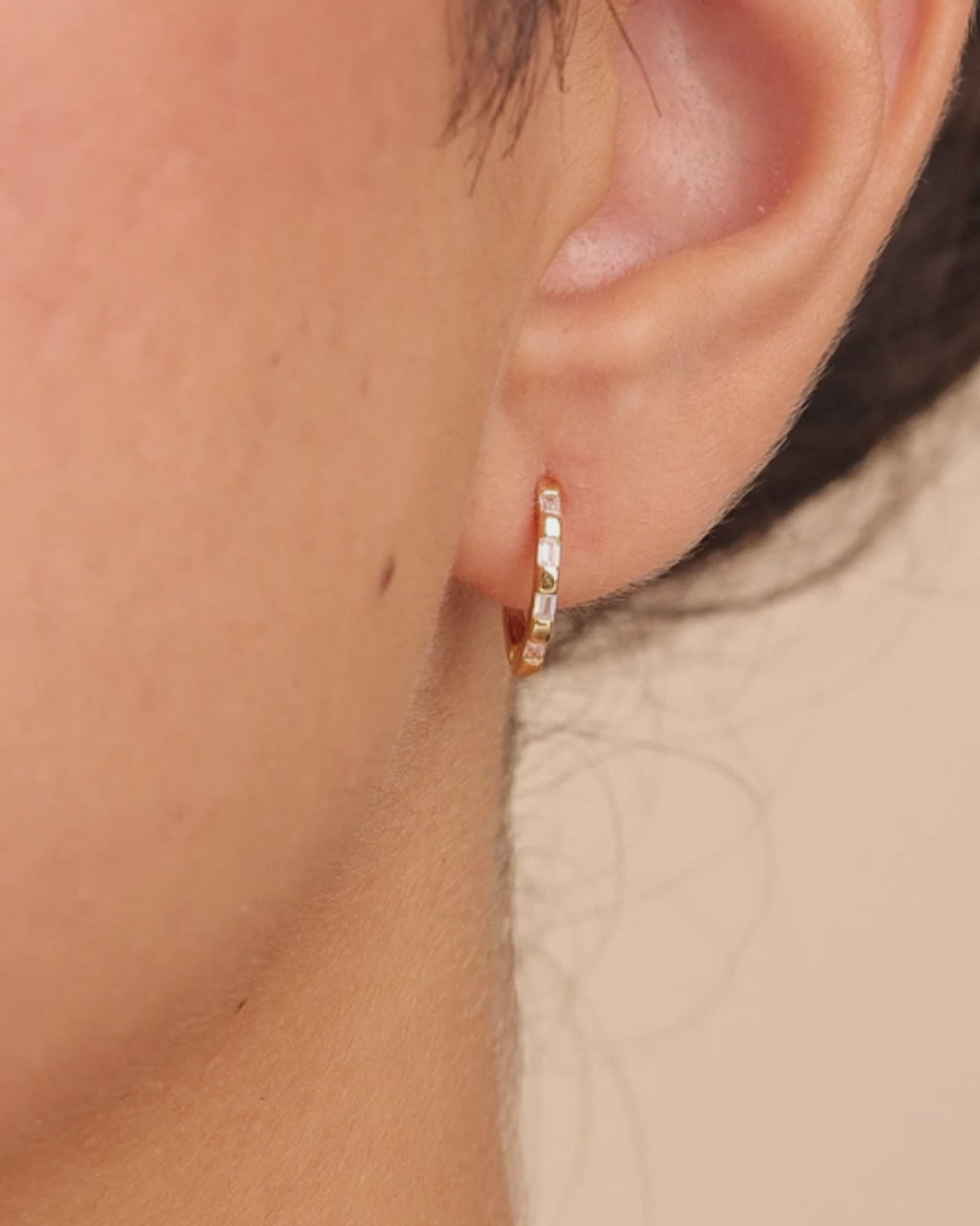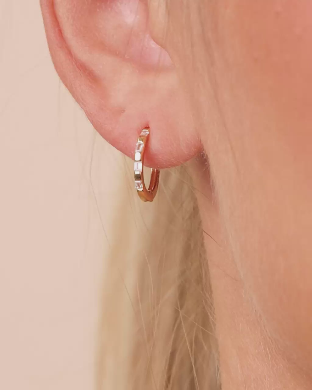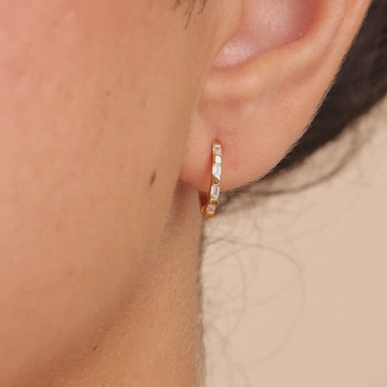Introducing our luxurious Sterling Silver Henley CZ Baguette Micro Hoop Earrings. Adorned with stationed and alternating baguette CZ, these earrings exude elegance and sophistication. Elevate your style with these premium hoops, perfect for any occasion.