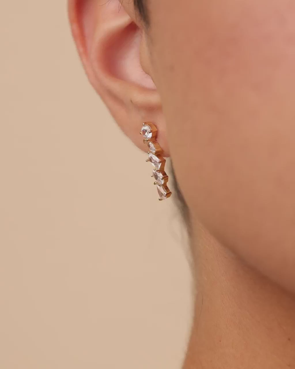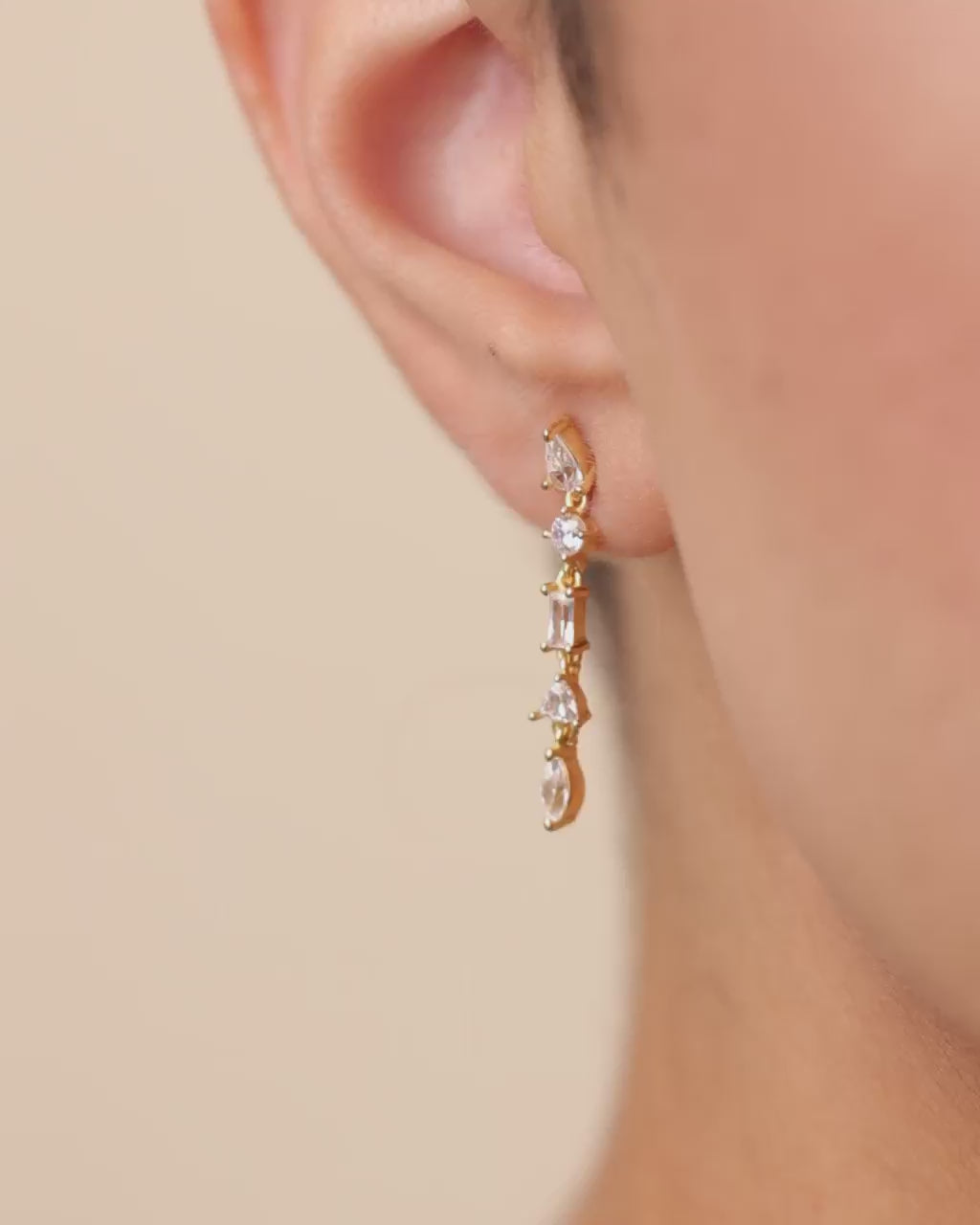 A straight line, but never boring. These drops stack marquise, round, and emerald-cut Hearts & Arrows CZs for a look that moves with you.