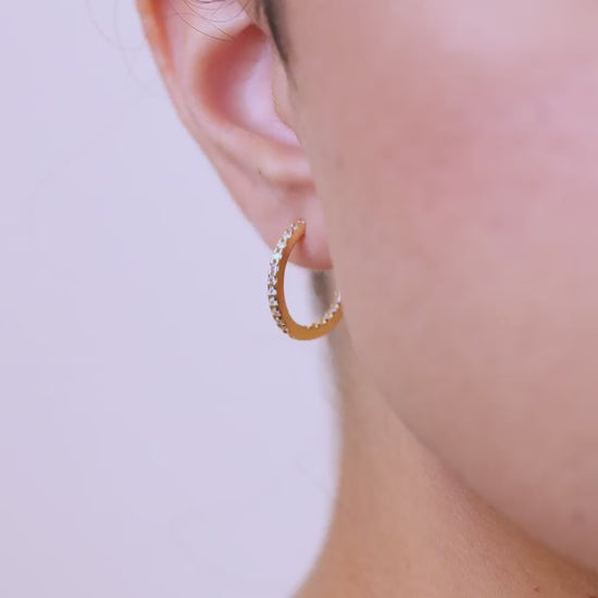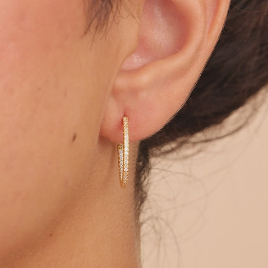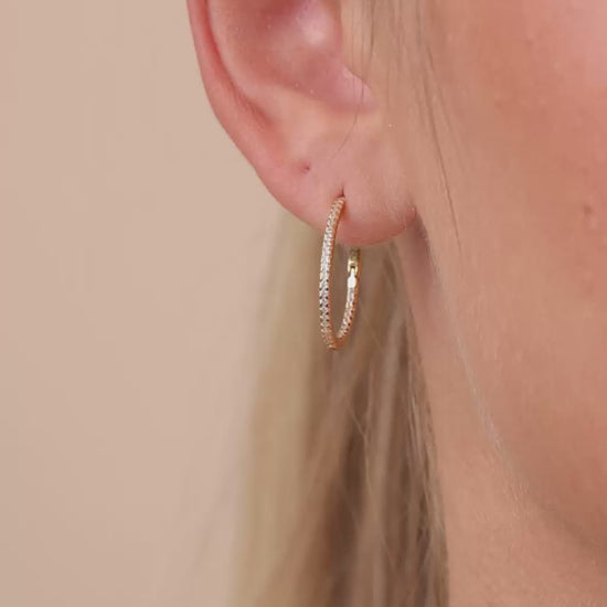 The Lilia CZ Infinity Hoops pack the punch from every angle. With Hearts & Arrows CZs set along the outside and inside of the sterling silver hoop, they hit the light no matter how you move. Finished with a secure lever-latch backing.