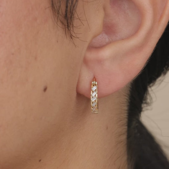 Baguette brilliance, reimagined. These micro hoops feature a luxe row of angled CZs in a crisscross setting—bold, refined, and built to stack or steal the show.