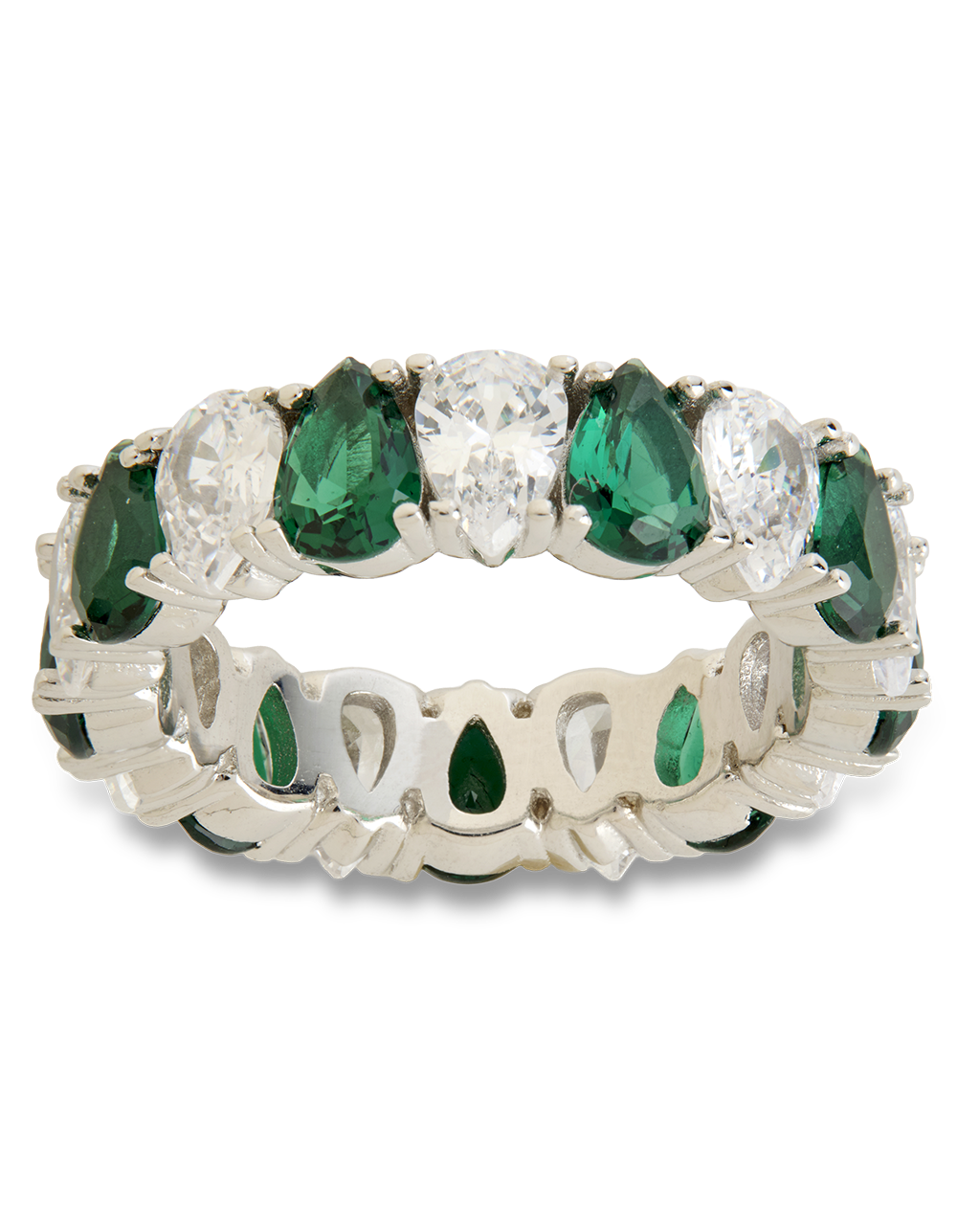 Bold. Brilliant. Unapologetically glam. This silver eternity ring features alternating pear-cut emerald and clear stones, made to turn heads every time you move.