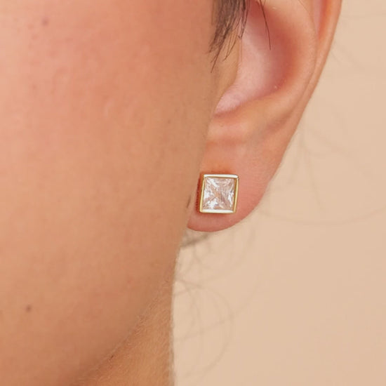 Features: 0.3x0.3X0.1 inch stud with 6x6mm CZ princess stones, post back, Lead and Nickel Free