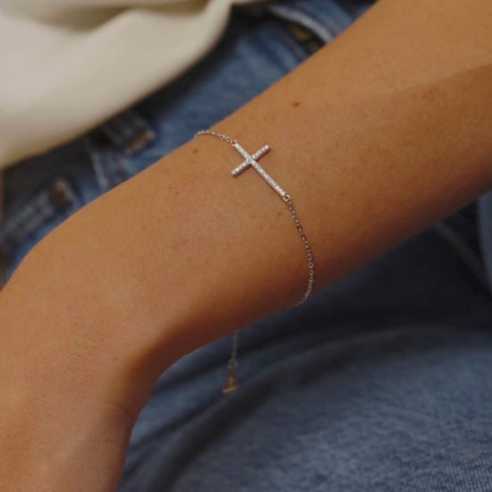 Show off your faith in a sweet and striking way with this delicate sterling silver sideways CZ cross bracelet! This sparkling accessory makes a great gift for a friend or family member. Adjustable to ensure the perfect fit.