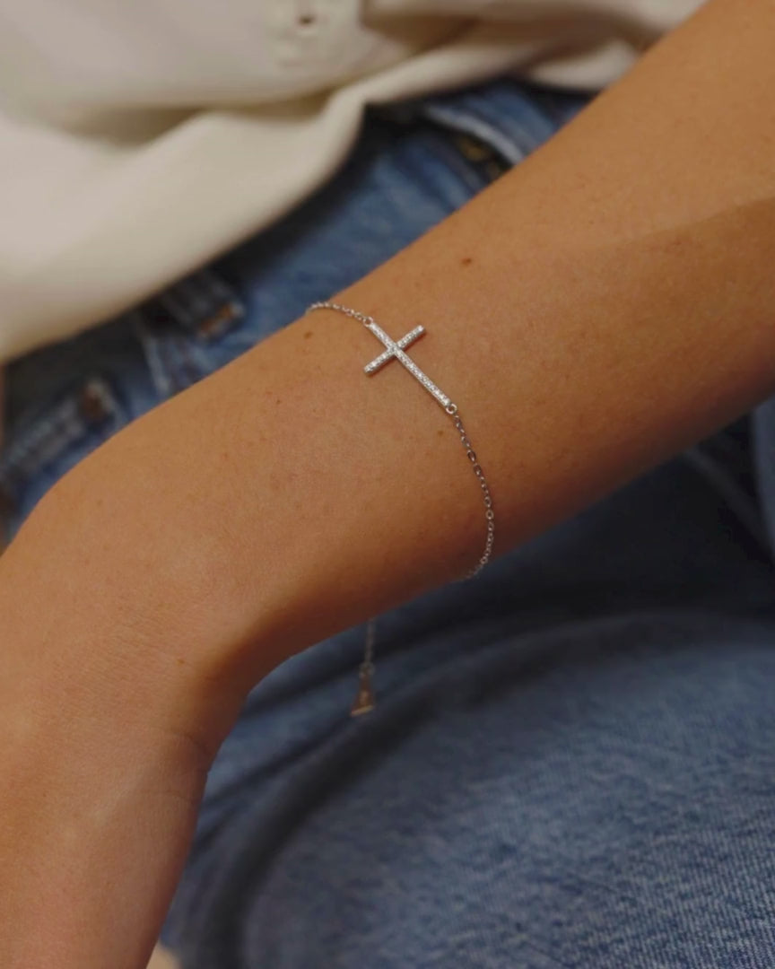 Show off your faith in a sweet and striking way with this delicate sterling silver sideways CZ cross bracelet! This sparkling accessory makes a great gift for a friend or family member. Adjustable to ensure the perfect fit.