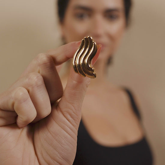 Elevate any outfit with our Sylvie Ripple Statement Studs. The curved polished ribbed stud and wave shape add a touch of sophistication and luxury. Perfect for the fashion-forward and discerning customer.