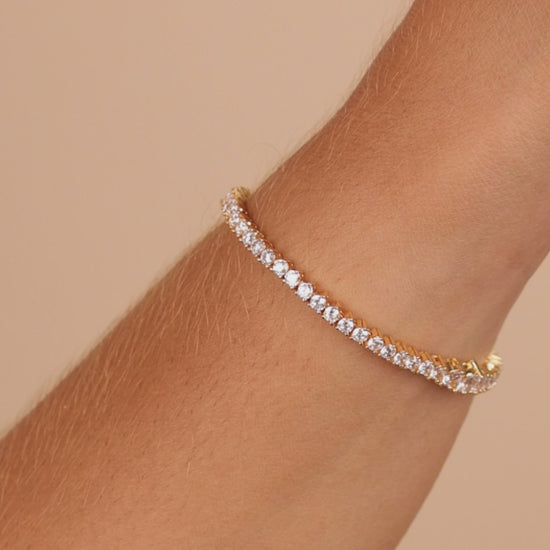 The Tatum CZ Tennis Bracelet is a twist on the classic. With Hearts & Arrows CZs and graduated round stones that get bigger in the center, it’s bold but still effortless.
