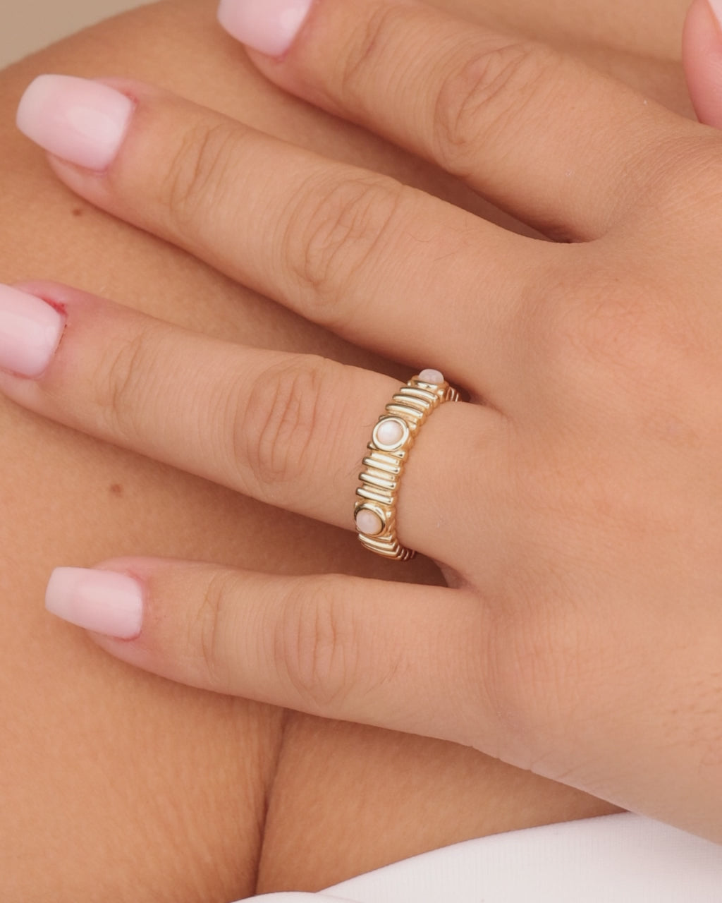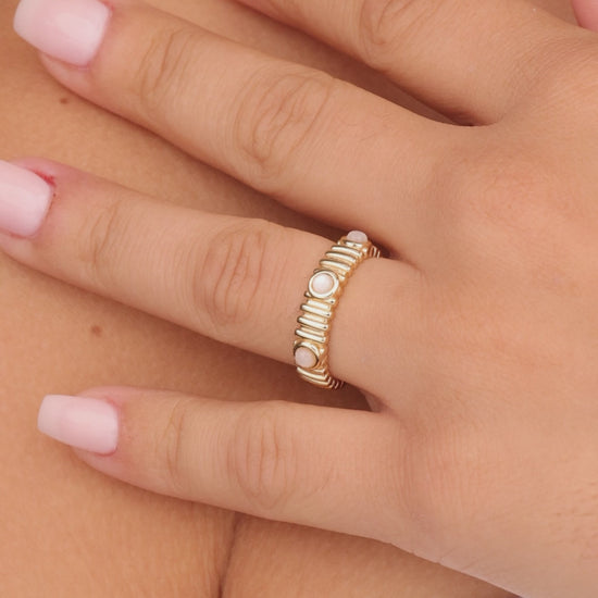 This luxurious ring is truly a work of art, featuring a delicate and timeless design. The pearl studded centerpiece adds a touch of elegance and sophistication, while the textured rib band adds a unique and tactile element. Add a touch of refinement to any look with this exquisite piece.