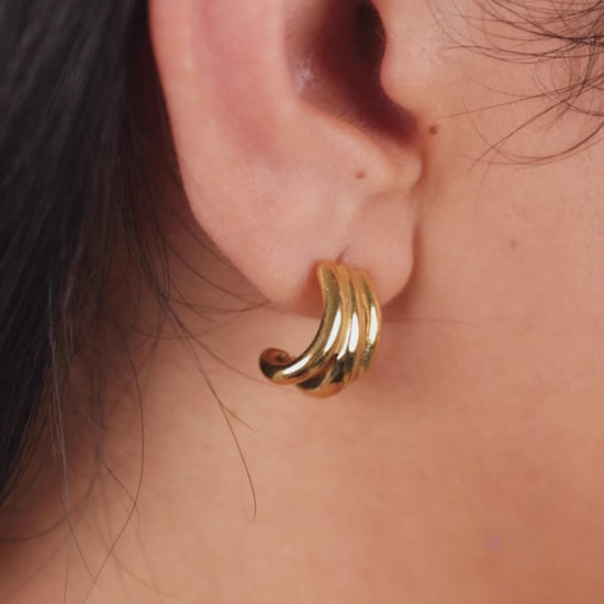 Triple the impact, zero the weight. The Triple Row Beatrix Statement Hoops feature a bold, layered design with curved openings that add dimension. Lightweight yet eye-catching, their versatile shape makes them a standout choice for elevating both everyday and dressed-up looks.