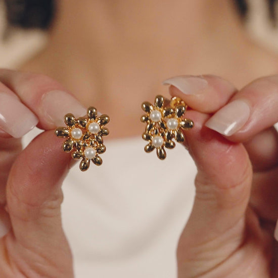 Add a touch of elegance to your look with Vallie Studs. These delicate stud earrings feature a beautiful flower cluster design adorned with lustrous pearls. Perfect for any occasion, these earrings add a sophisticated and exclusive touch to any outfit.