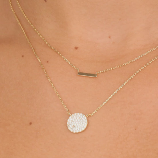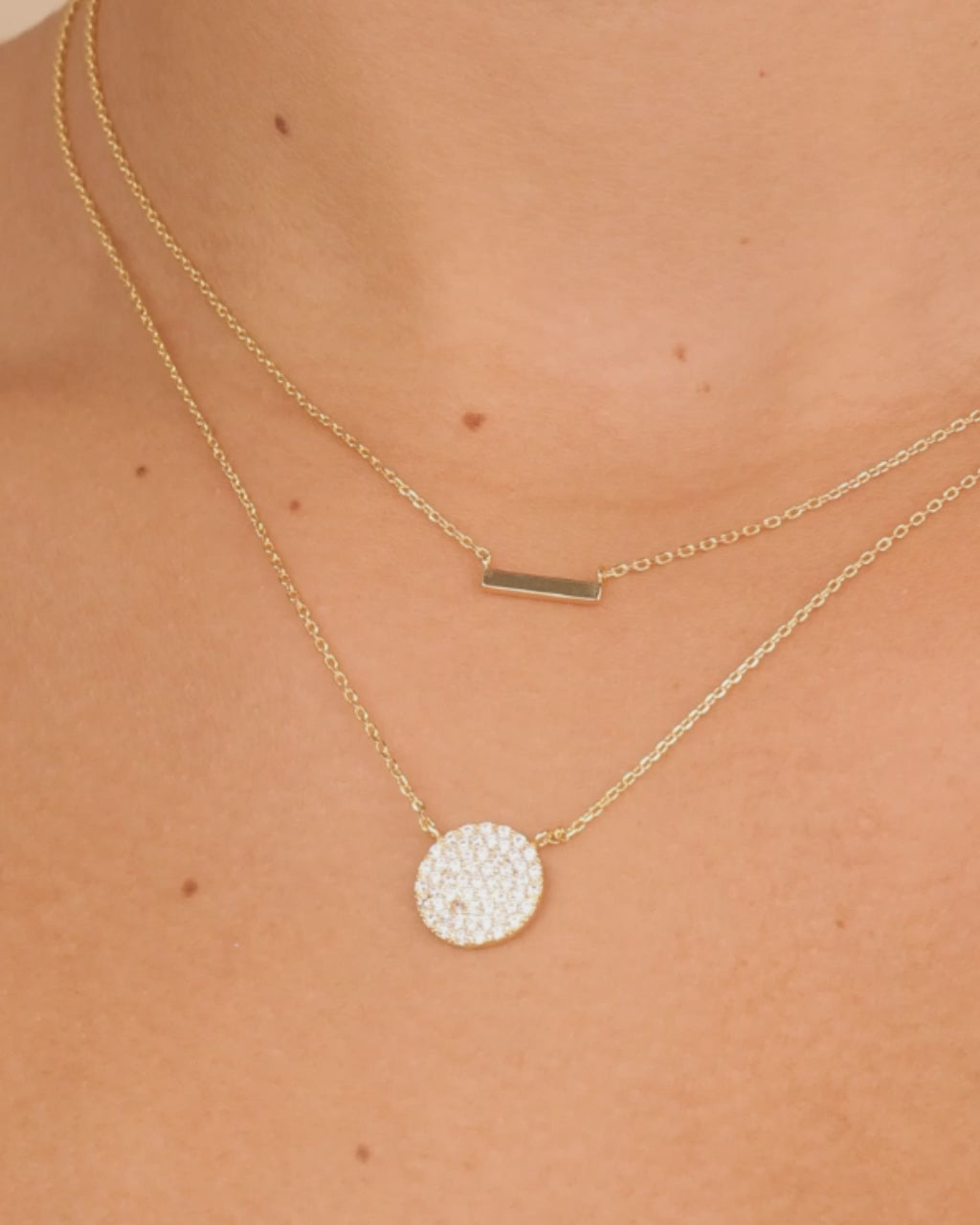Love luxe layers? This dainty, feminine necklace will become your new fave! It features a smooth bar and a CZ-studded disk. Available in gold and silver tones and adjustable for a perfect fit.