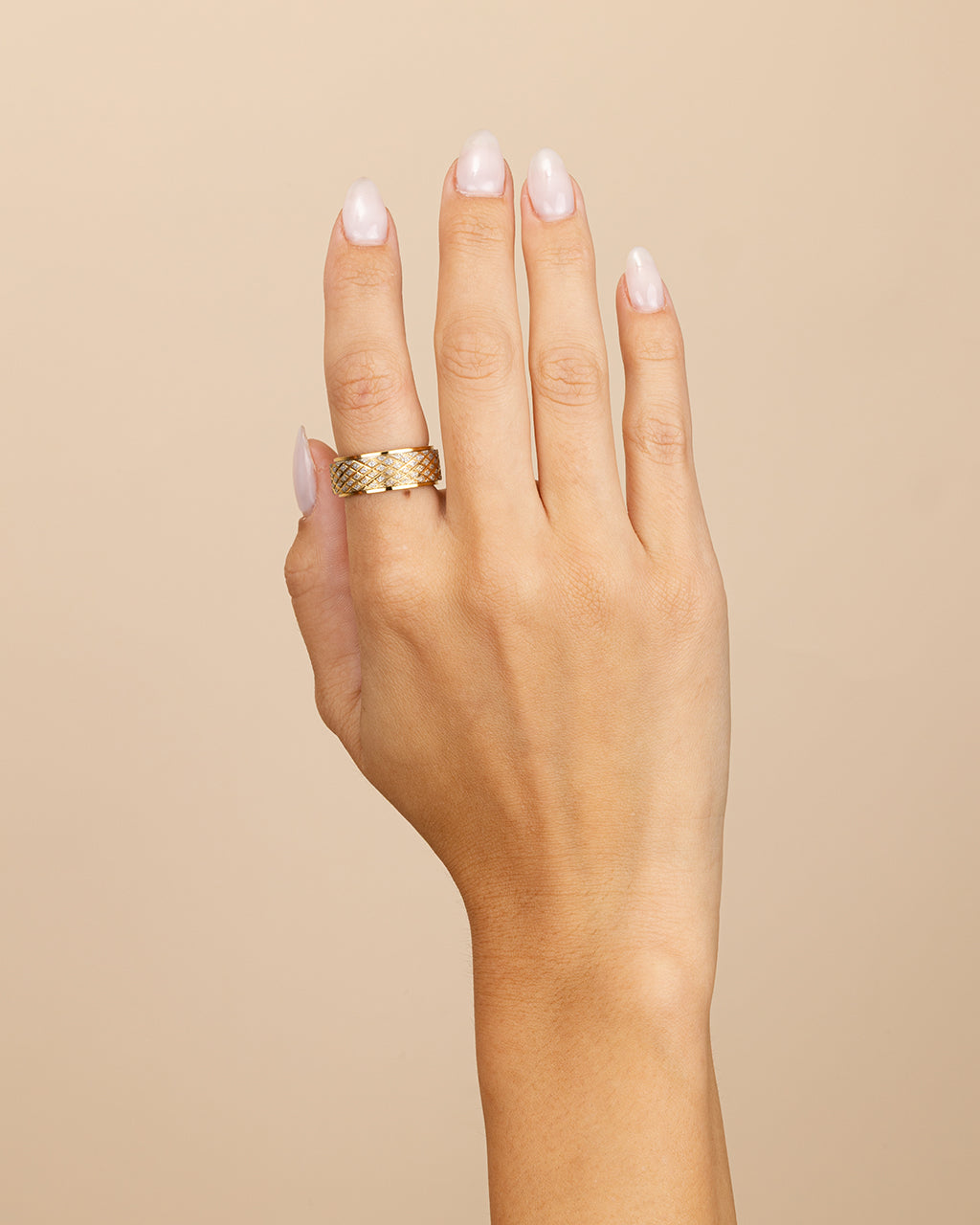 Sculptural and tactile, this spinner ring pairs a sleek silhouette with a laser-cut diamond texture that catches the light from every angle. The top band rotates smoothly over the wide base, adding a subtle detail you’ll want to fidget with all day. It’s the kind of statement piece that doesn’t beg for attention—just quietly owns it.